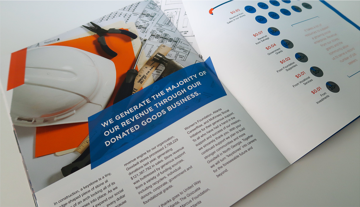 Goodwill wanted to present a visually elevated annual report in order to keep people engaged with the information presented. We utilized the theme of “building” to develop supportive imagery, icons and infographics to better explain the stories, data and facts.